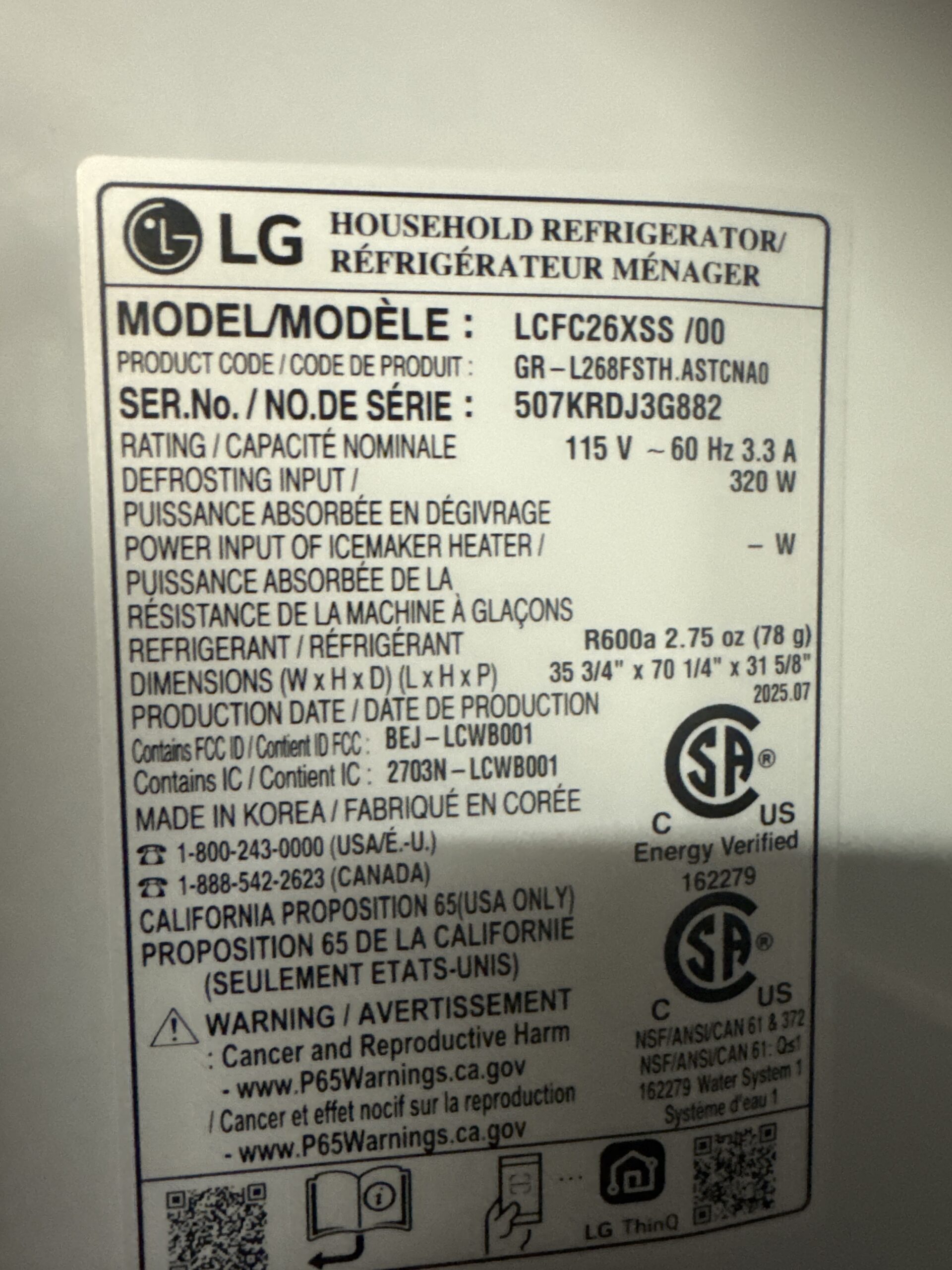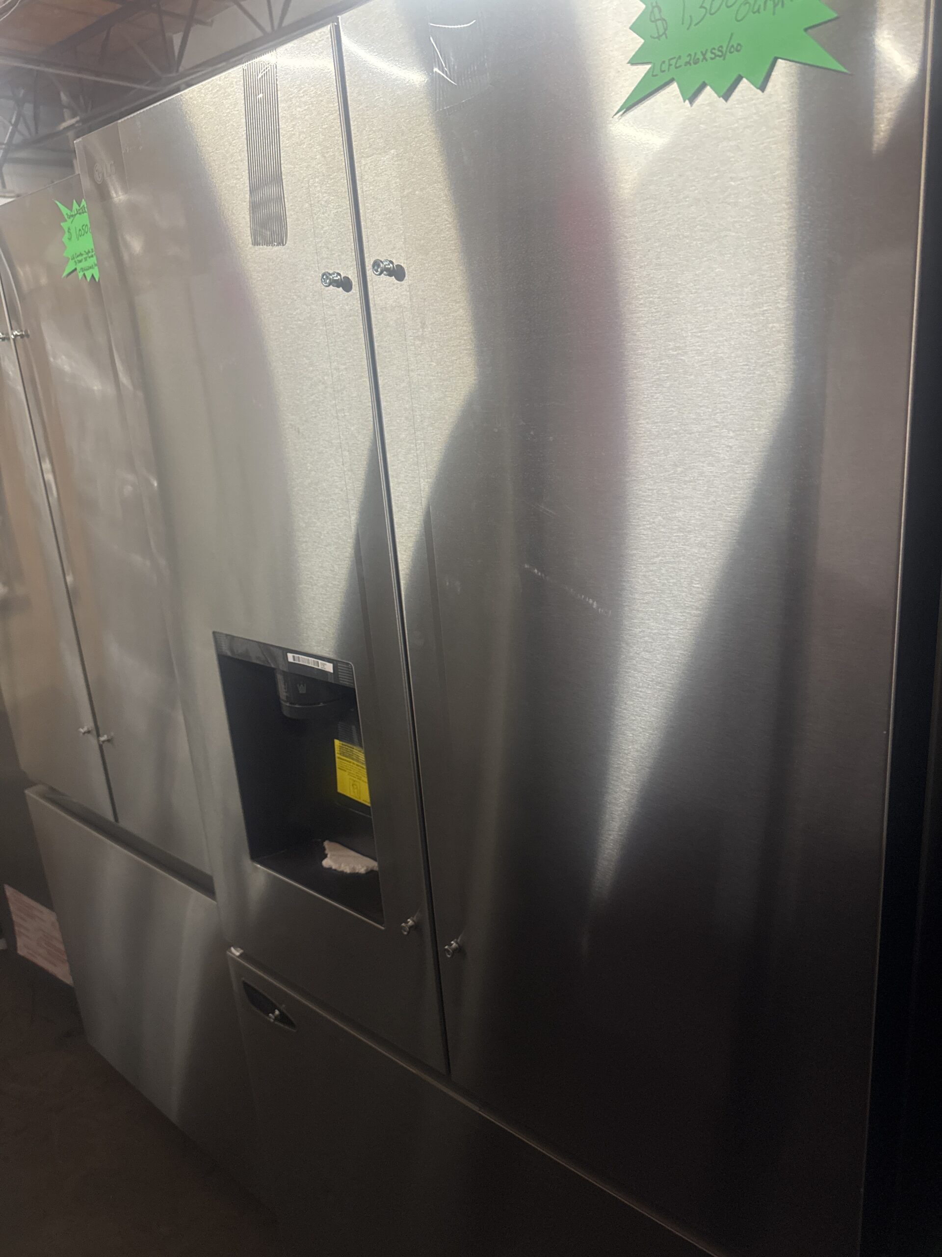 Upgrade your kitchen with this spacious and reliable LG French Door Refrigerator (Model: LCFC26XSS/00). Designed for both style and functionality, this unit offers a massive 25.5 cu. ft. capacity, providing ample room for all your groceries, large platters, and beverages.